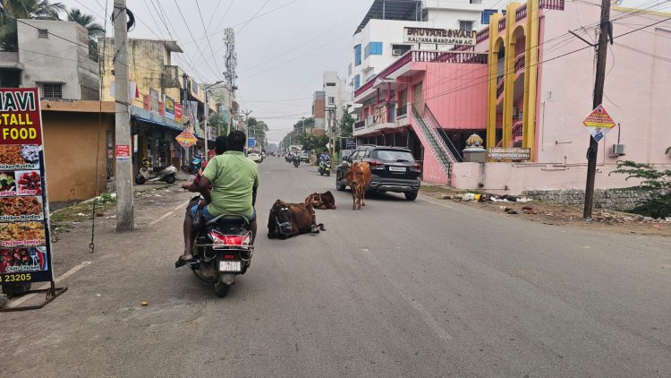 அப்படிப்பட்ட பிஸியான சாலையில் மாடுகள் சாவகாசமாக படுத்துக் கொண்டு பொதுமக்களுக்கு இடைஞ்சல் ஏற்படுத்தி வருகின்றது.