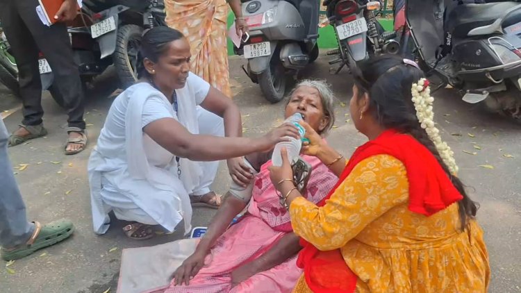 இதே போல சேண்பாக்கத்தை சேர்ந்த பத்மா என்ற மூதாட்டி தனக்கு வீட்டுமனைப்பட்டா வேண்டுமென கேட்டு மனு அளிக்க வந்து வெய்யிலின் தாக்கத்தால் அவர் மய்ங்கி விழுந்தார் அவரையும் காவல்துறையினர் மருத்துவ சிகிச்சைக்கு அனுப்பினார்கள் இதனால் ஆட்சியர் அலுவலகத்தில் சிறிது நேரம் பரபரப்பு காணப்பட்டது